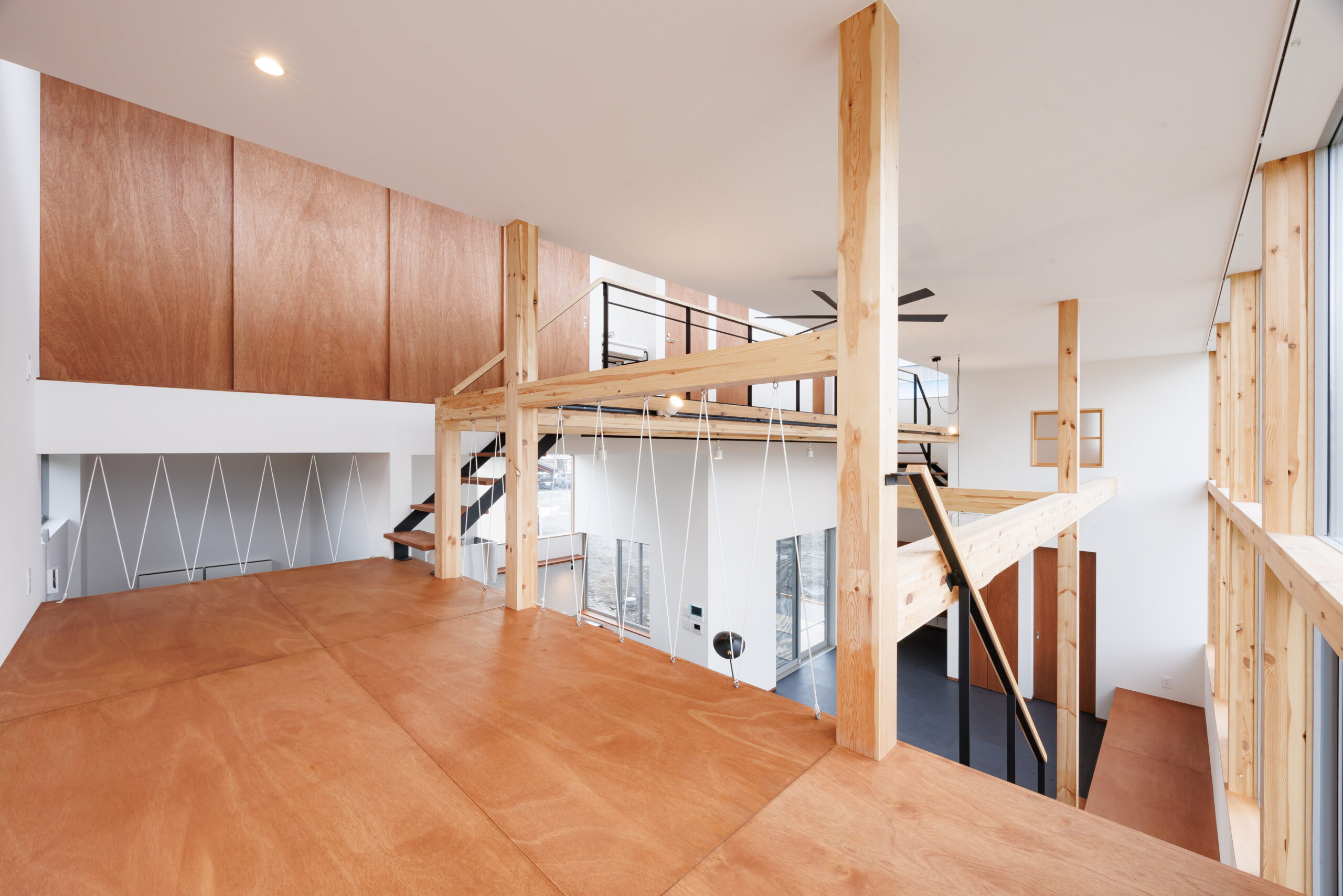 リビングの大きな吹き抜けと、構造を現したデザインが印象的です。
