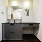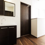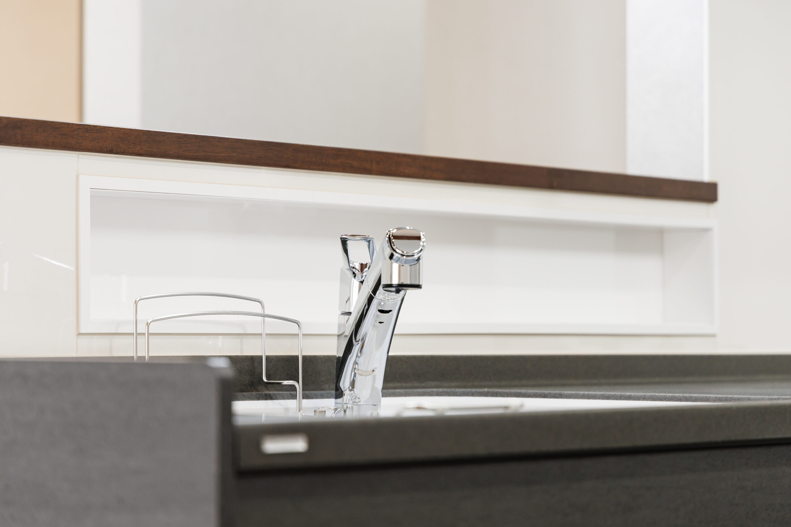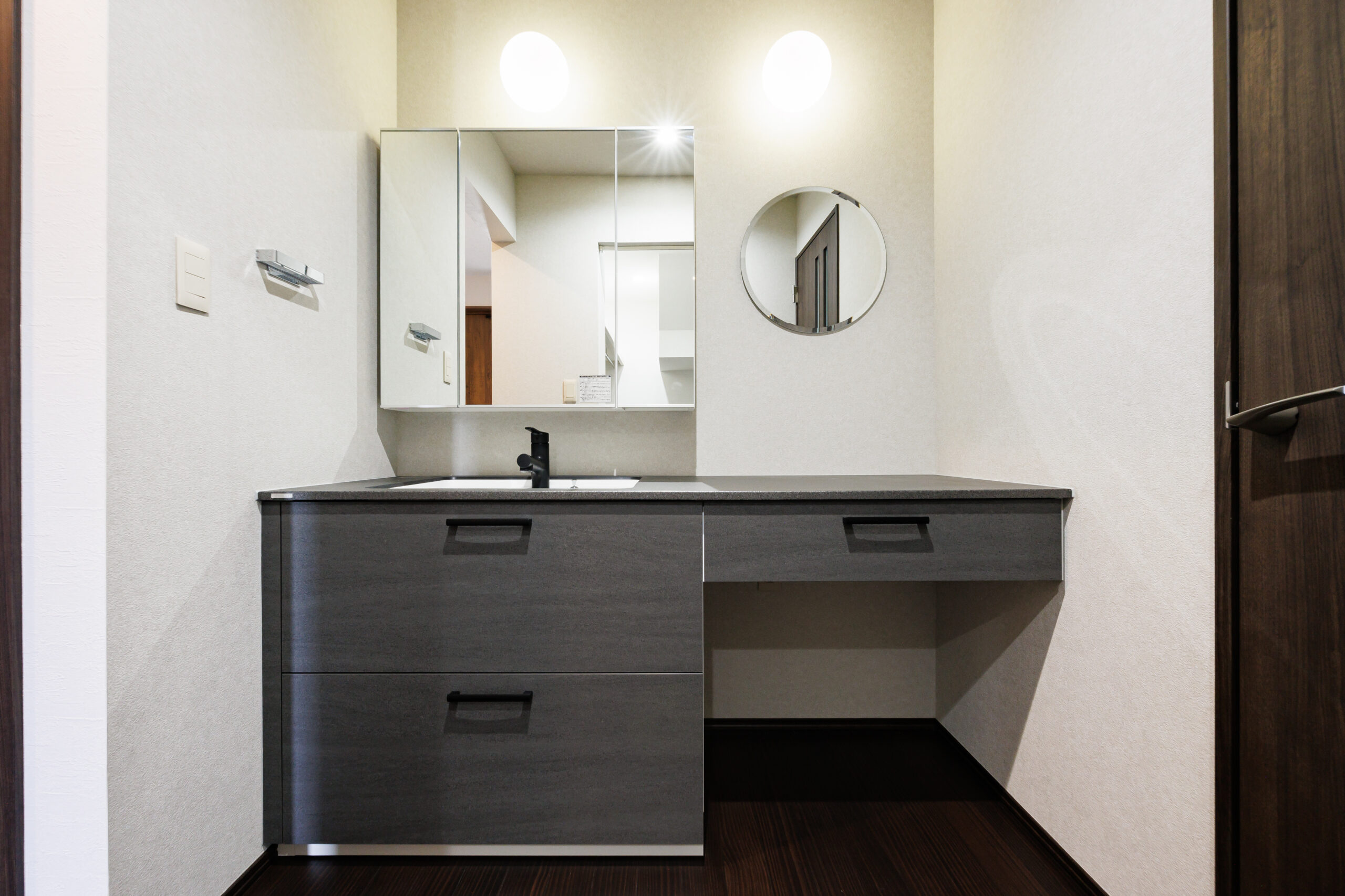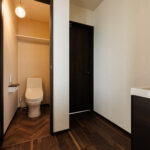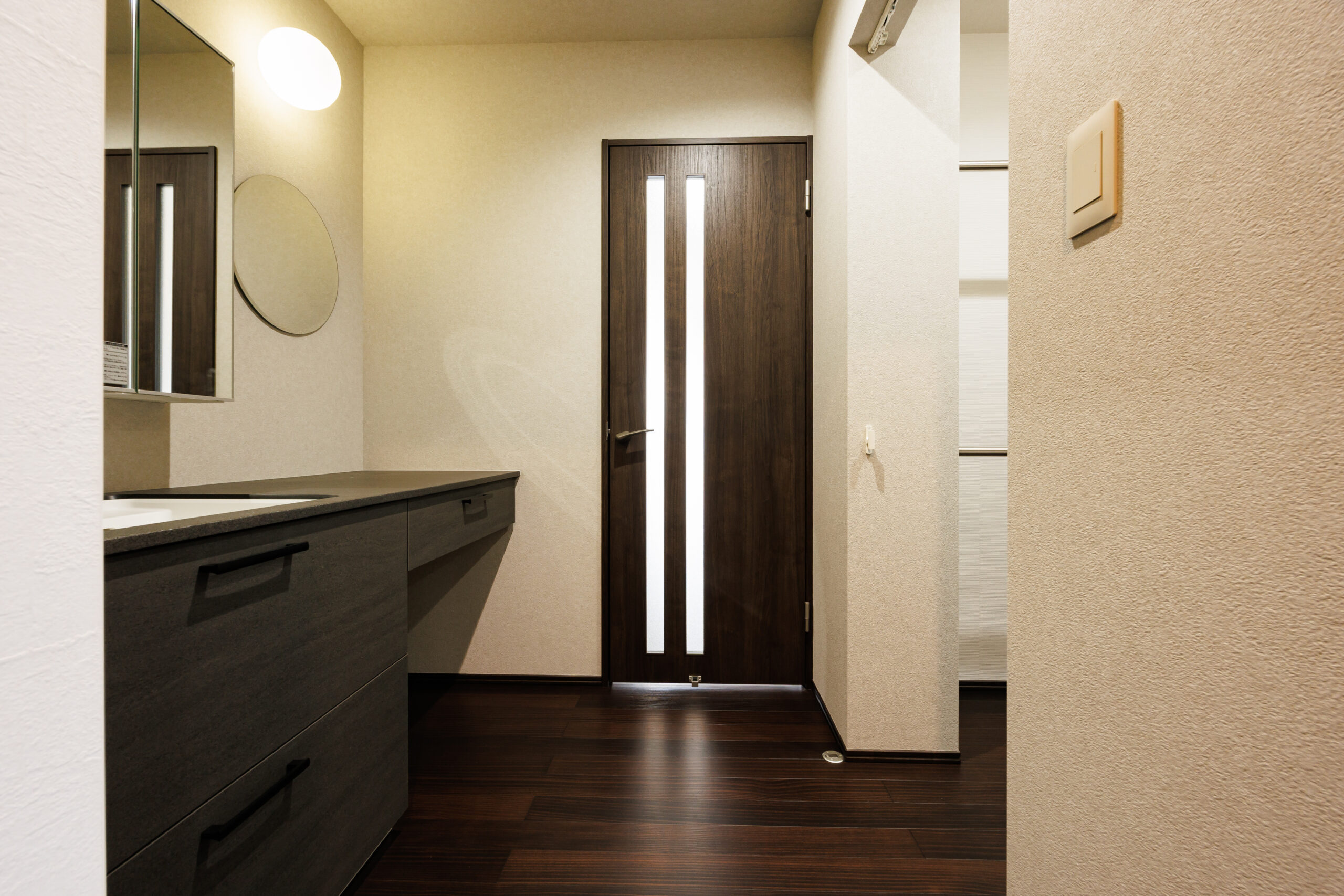 さらに、キッチン横にはランドリー兼脱衣室を配置。移動距離を最小限に抑えた効率的な家事動線により、日々の負担を軽減します。洗面台にはトクラスの上位モデル「Noare(ノーレ)W1680」を採用し、使い勝手とデザイン性を両立しました。