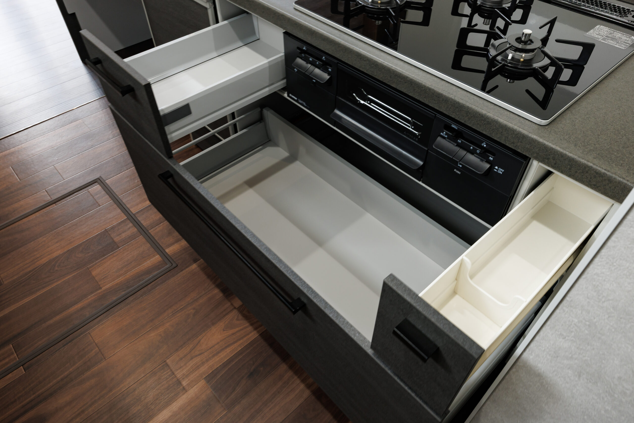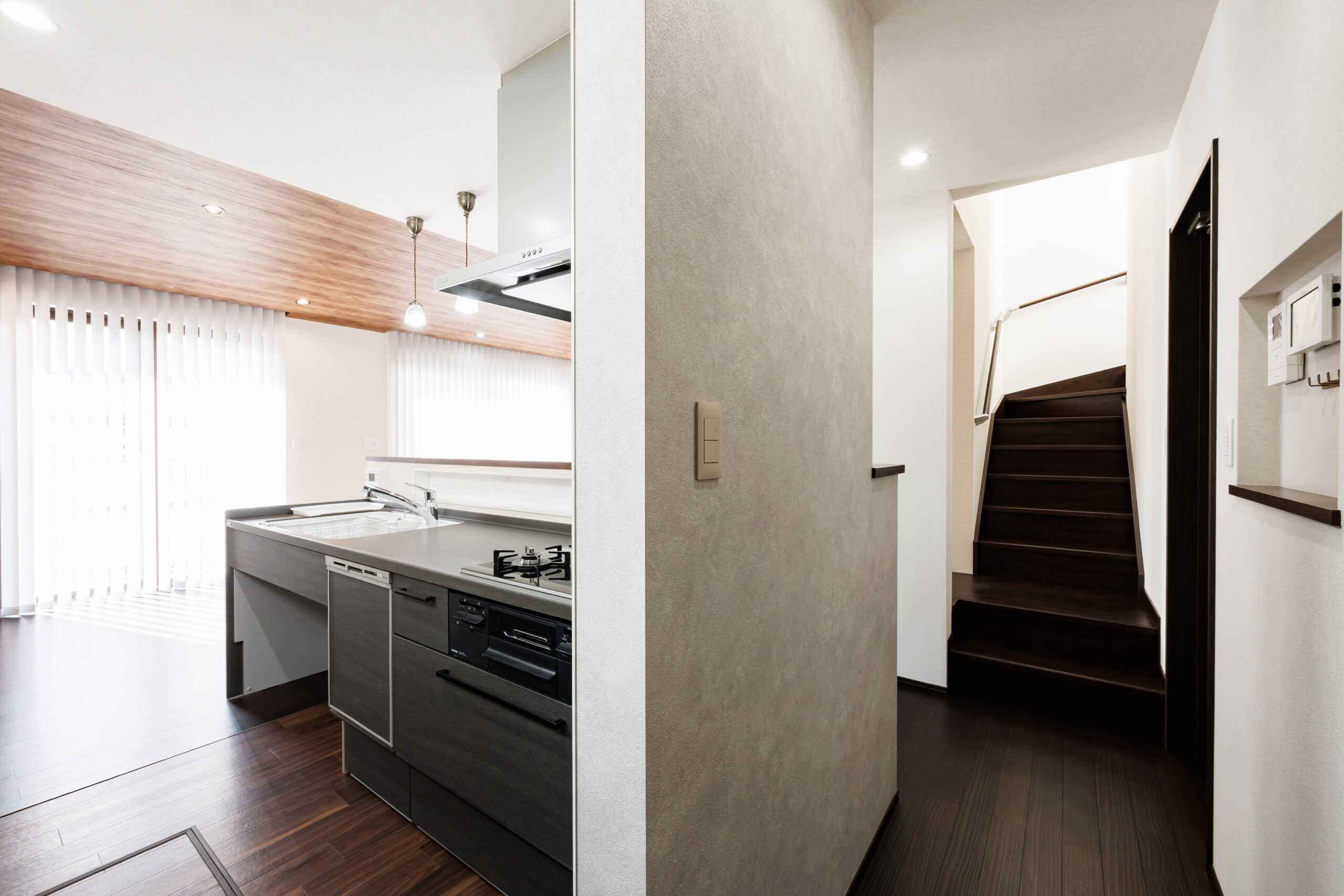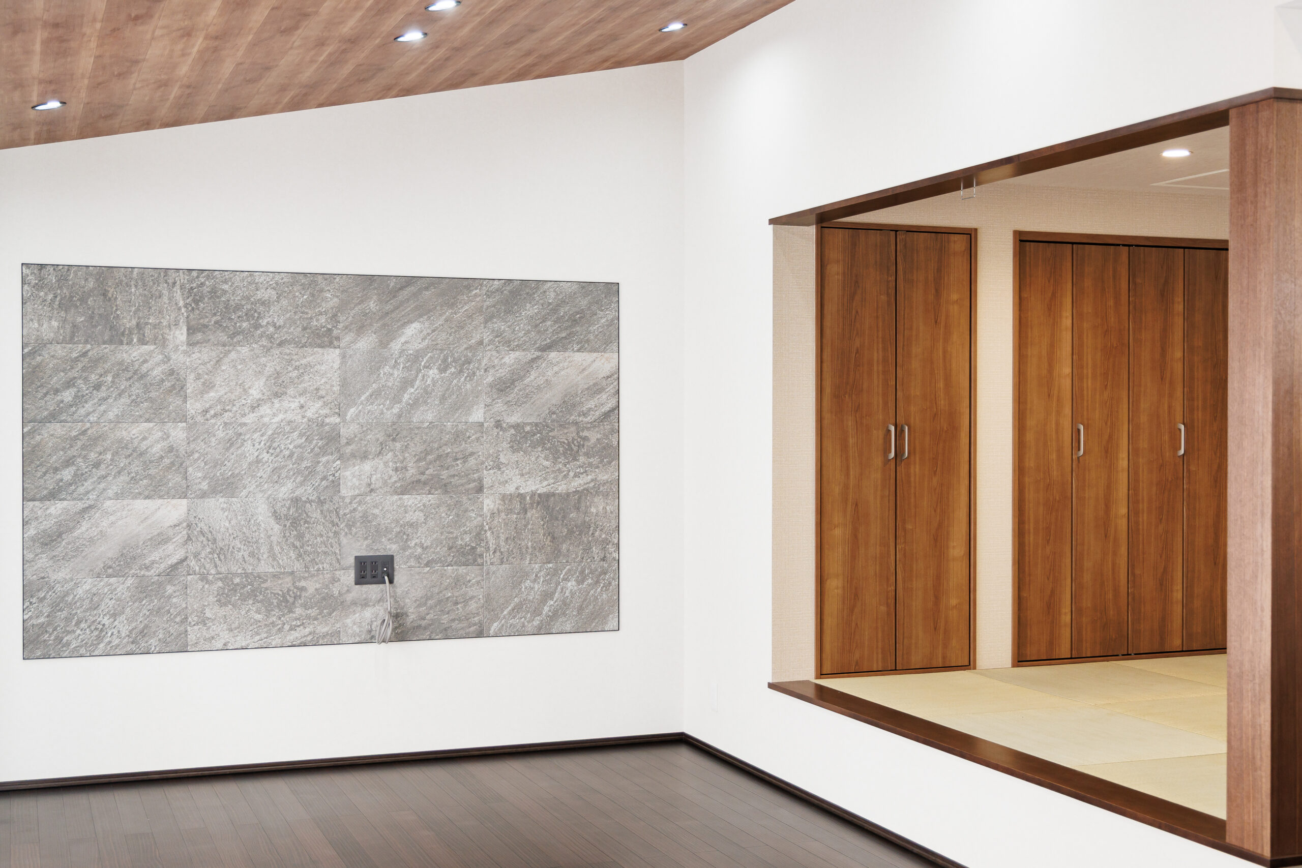 キッチンにはトクラスBを採用し、小上がり和室・ダイニング・リビングを一望できる配置に。テレビを見ながら料理ができる設計で、暮らしの楽しさをより一層引き立てます。壁面にはアクセントとしてエコカラットを取り入れ、上質な空間に仕上げました。