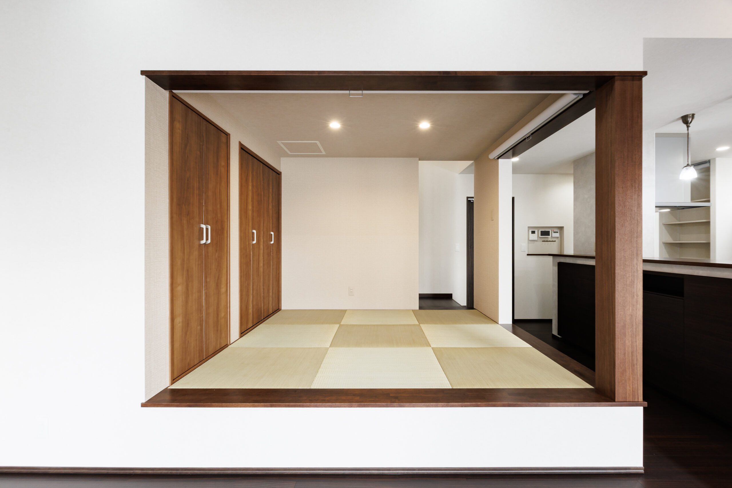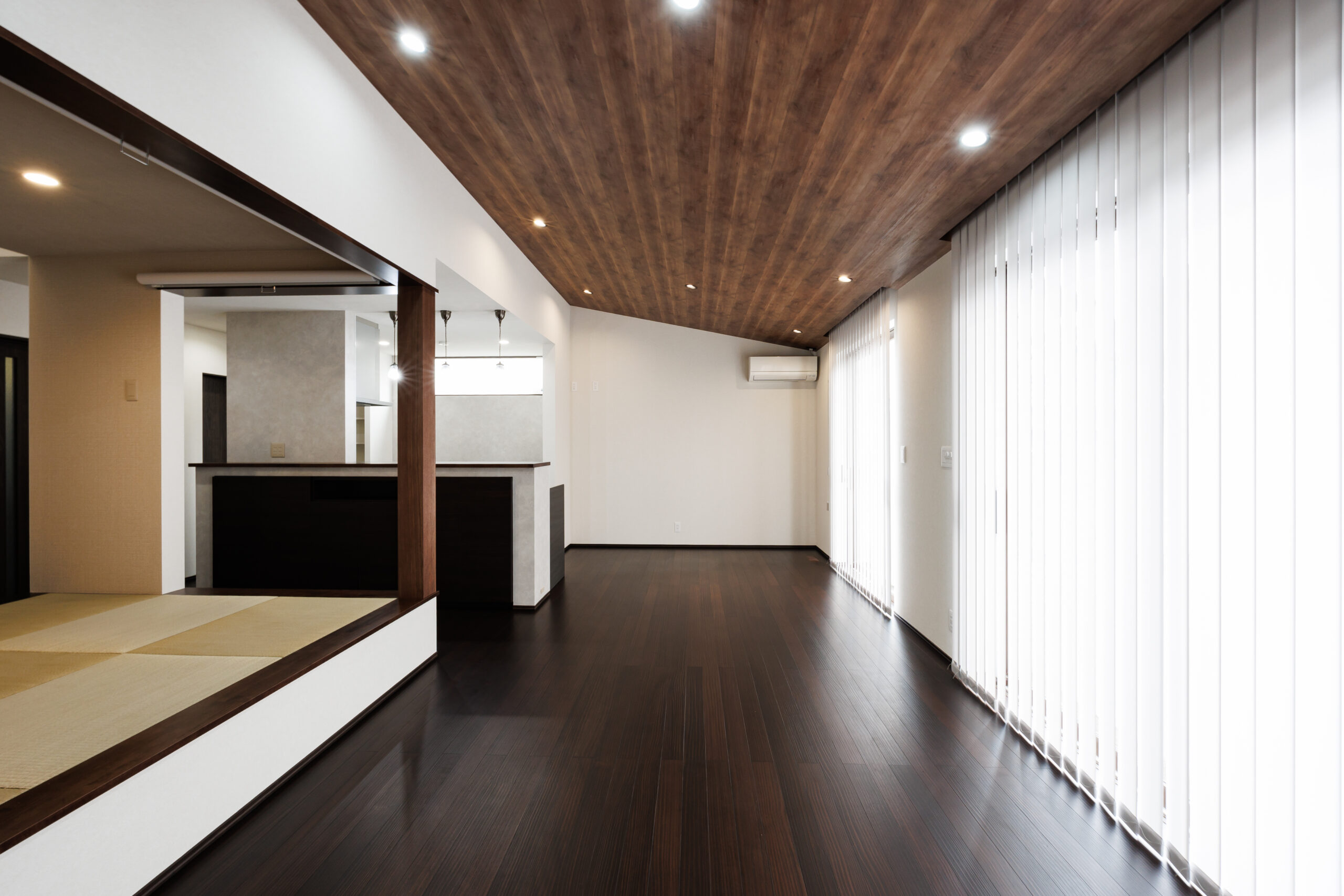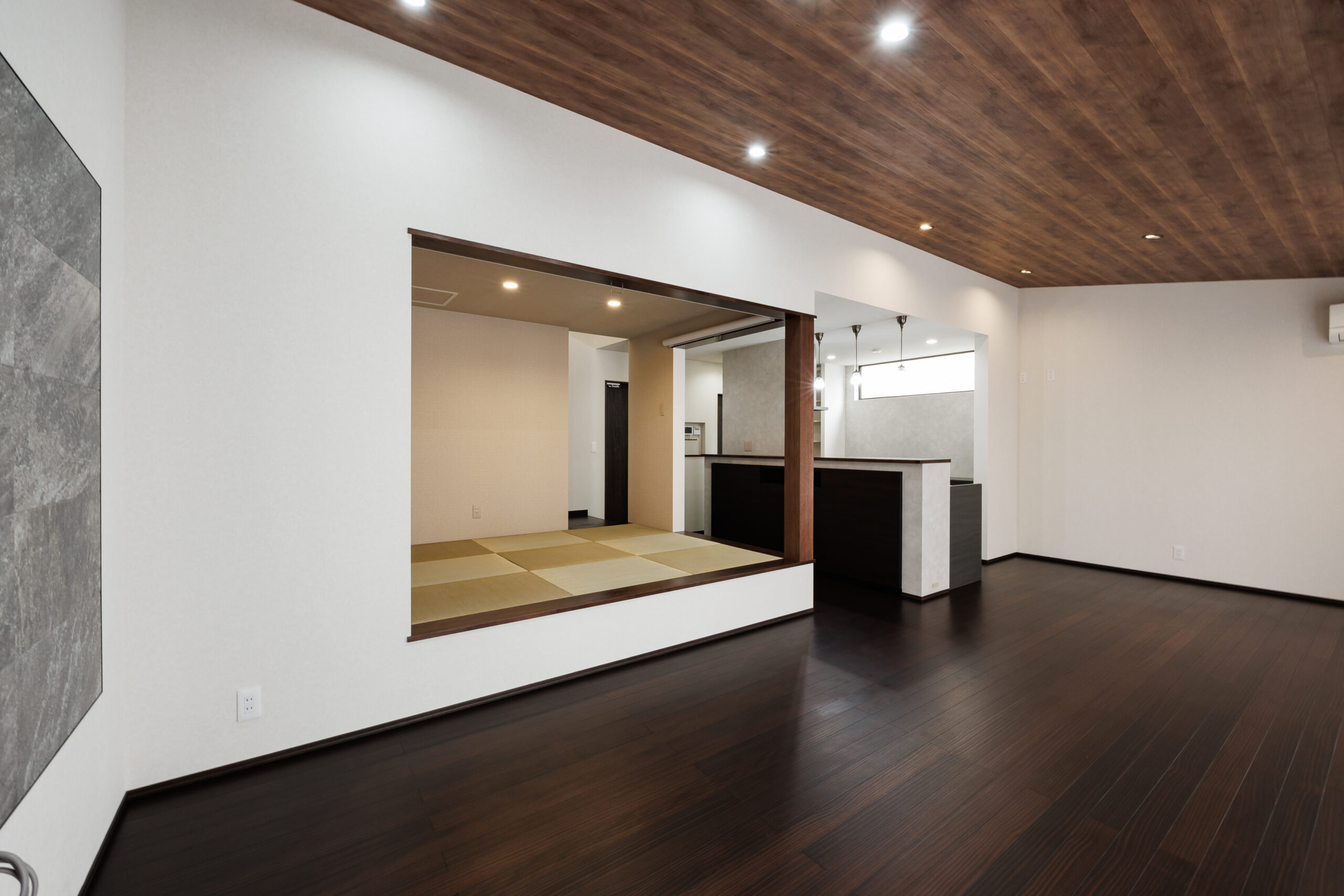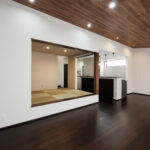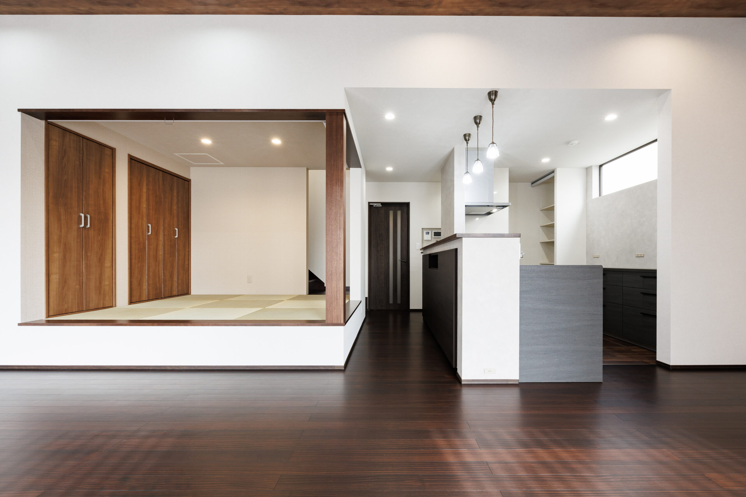 間取りの大きな特徴は、21帖のLDKに3.75帖の小上がり和室を組み合わせた、開放感と使い勝手を兼ね備えた空間設計です。和室にはイ草の畳を採用し、心地よい香りとともに落ち着いた時間を演出。将来は寝室としても使えるよう、ロールスクリーンで仕切れる仕様としました。