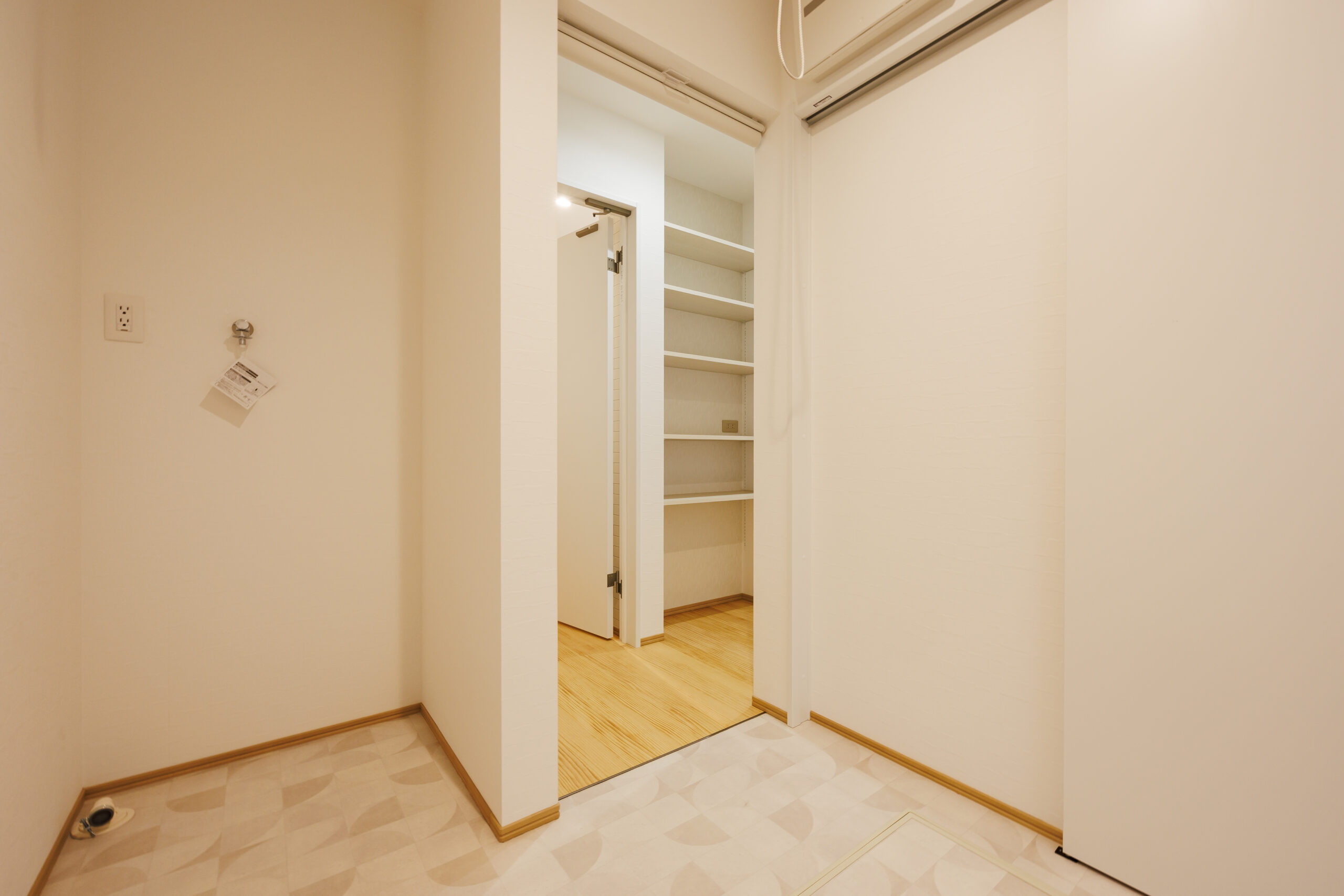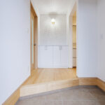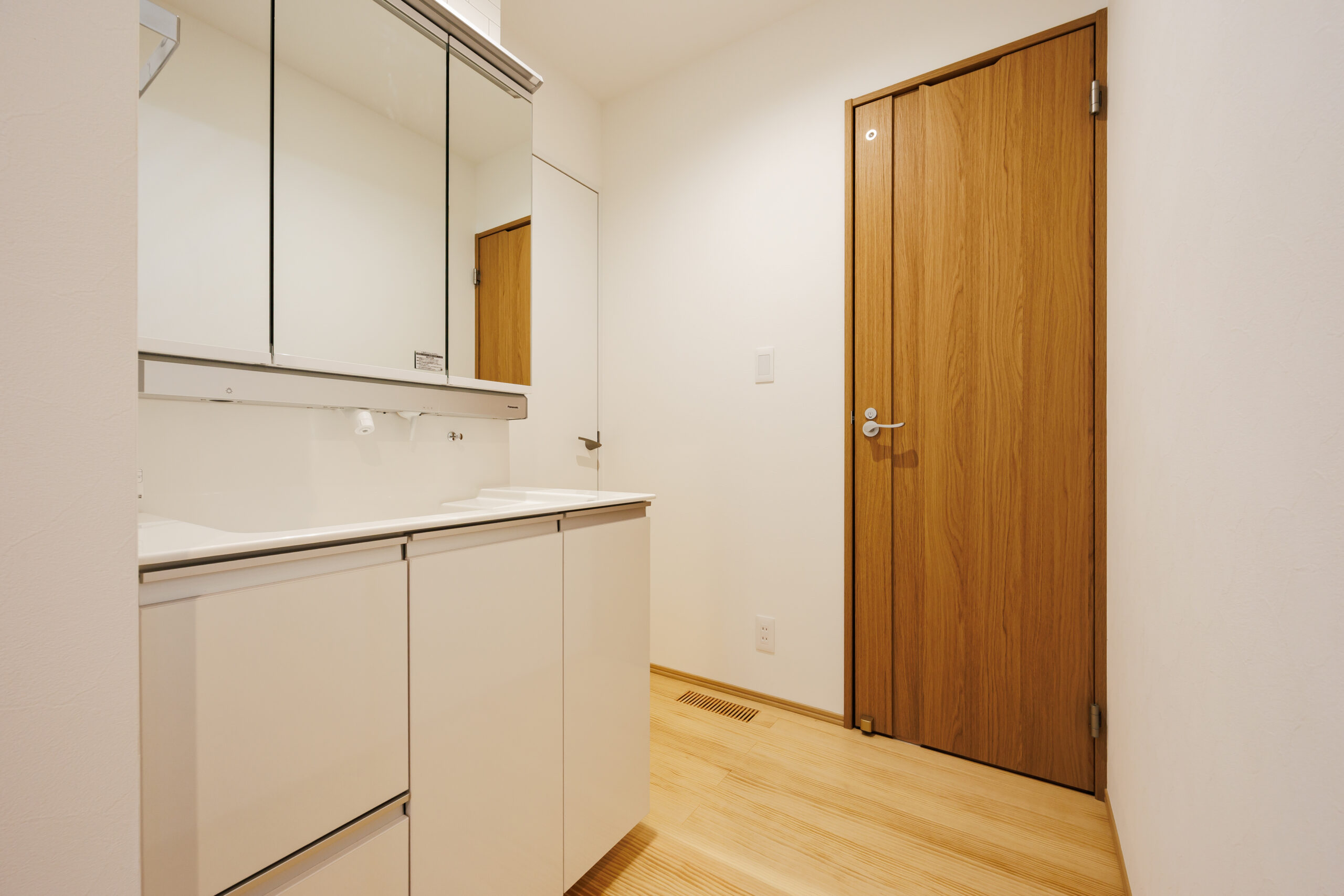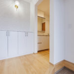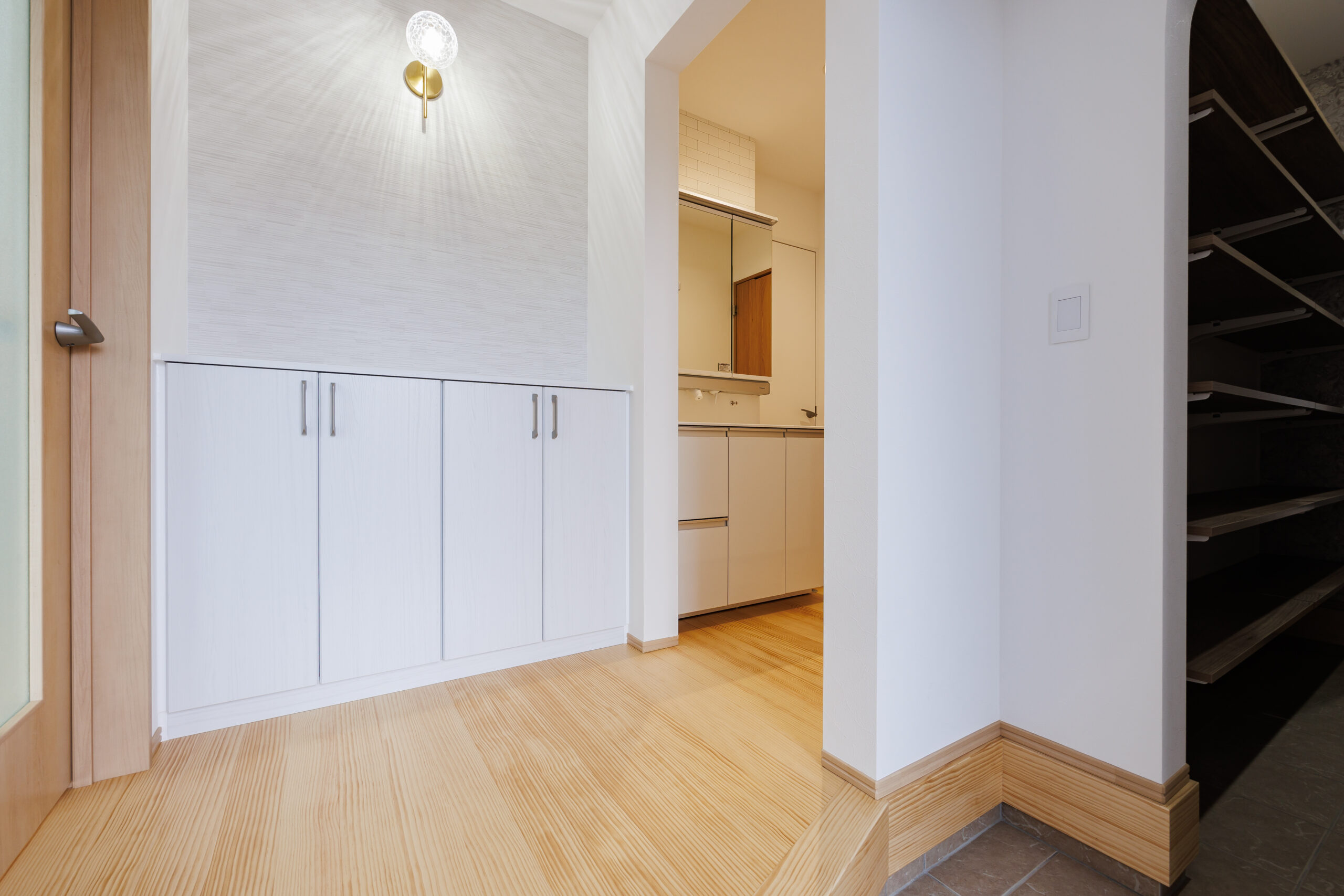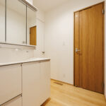 玄関ホールのすぐ横には洗面化粧台とお手洗いを配置し、帰宅後すぐに手洗いができる安心動線を実現。日々の暮らしの中で自然と衛生習慣が身につく、家族にやさしい設計です。