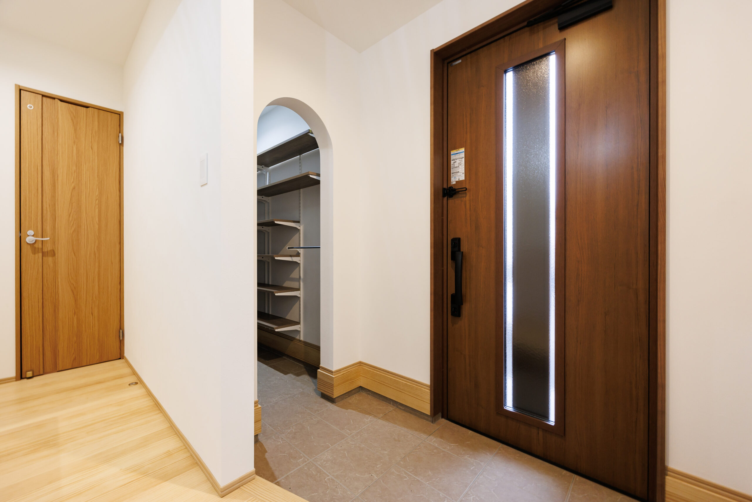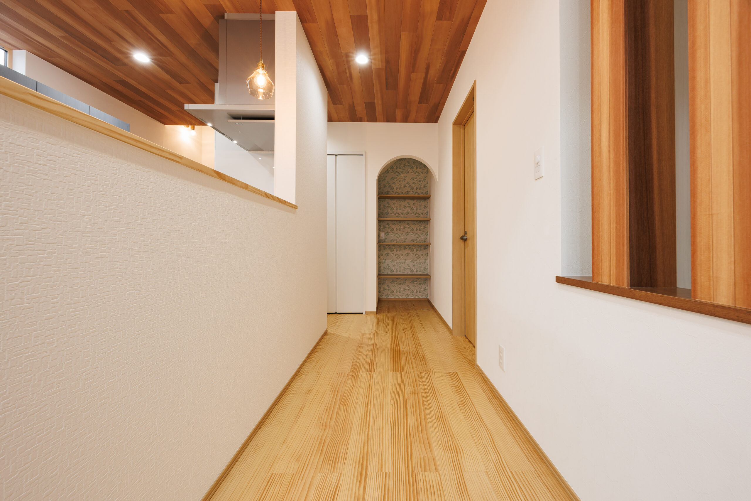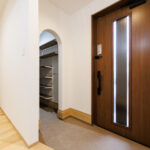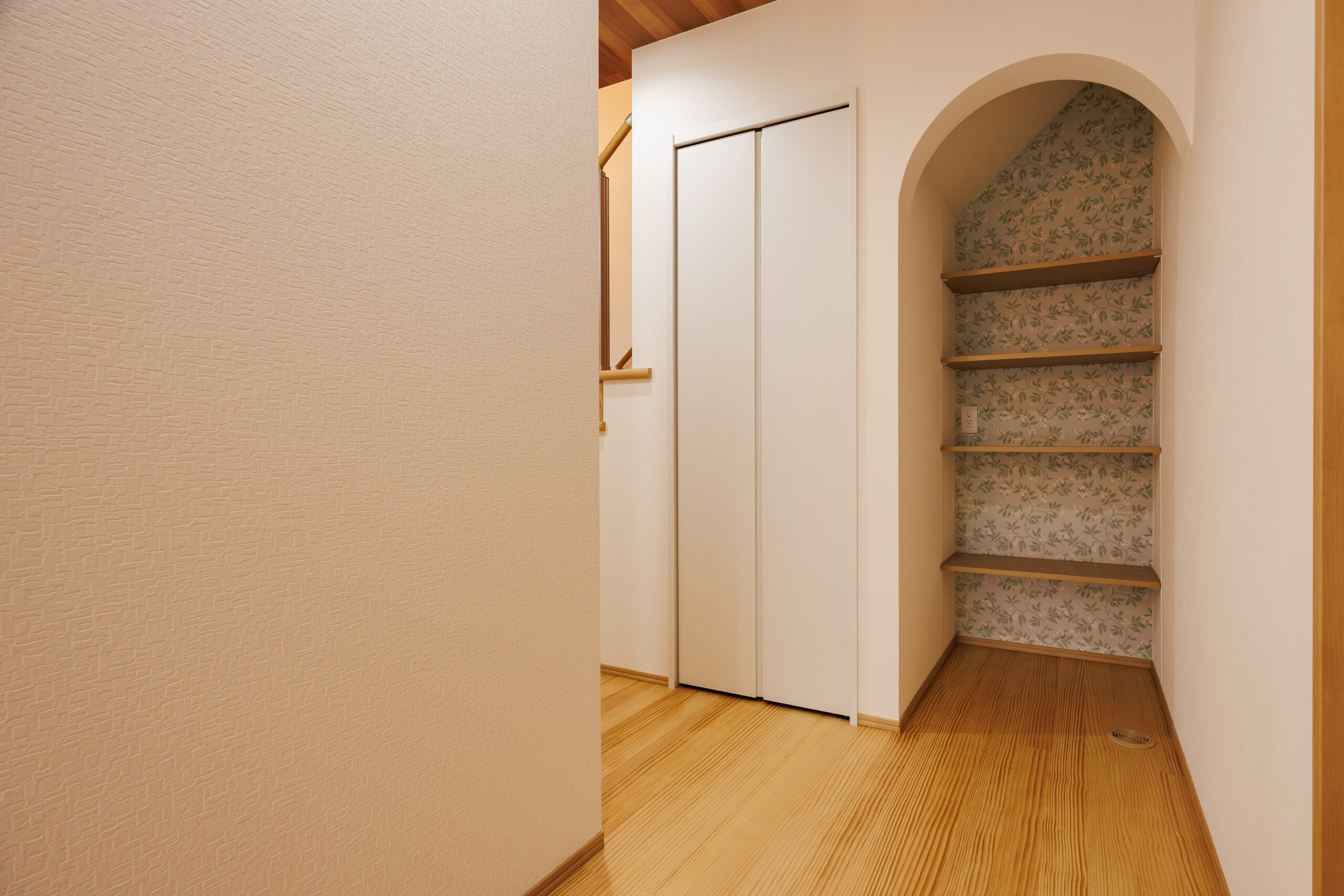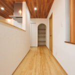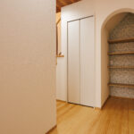 階段下のスペースも無駄なく活用し、アーチ状の垂れ壁をアクセントにした収納を設けることで、見た目の可愛らしさと実用性を兼ね備えています。