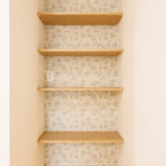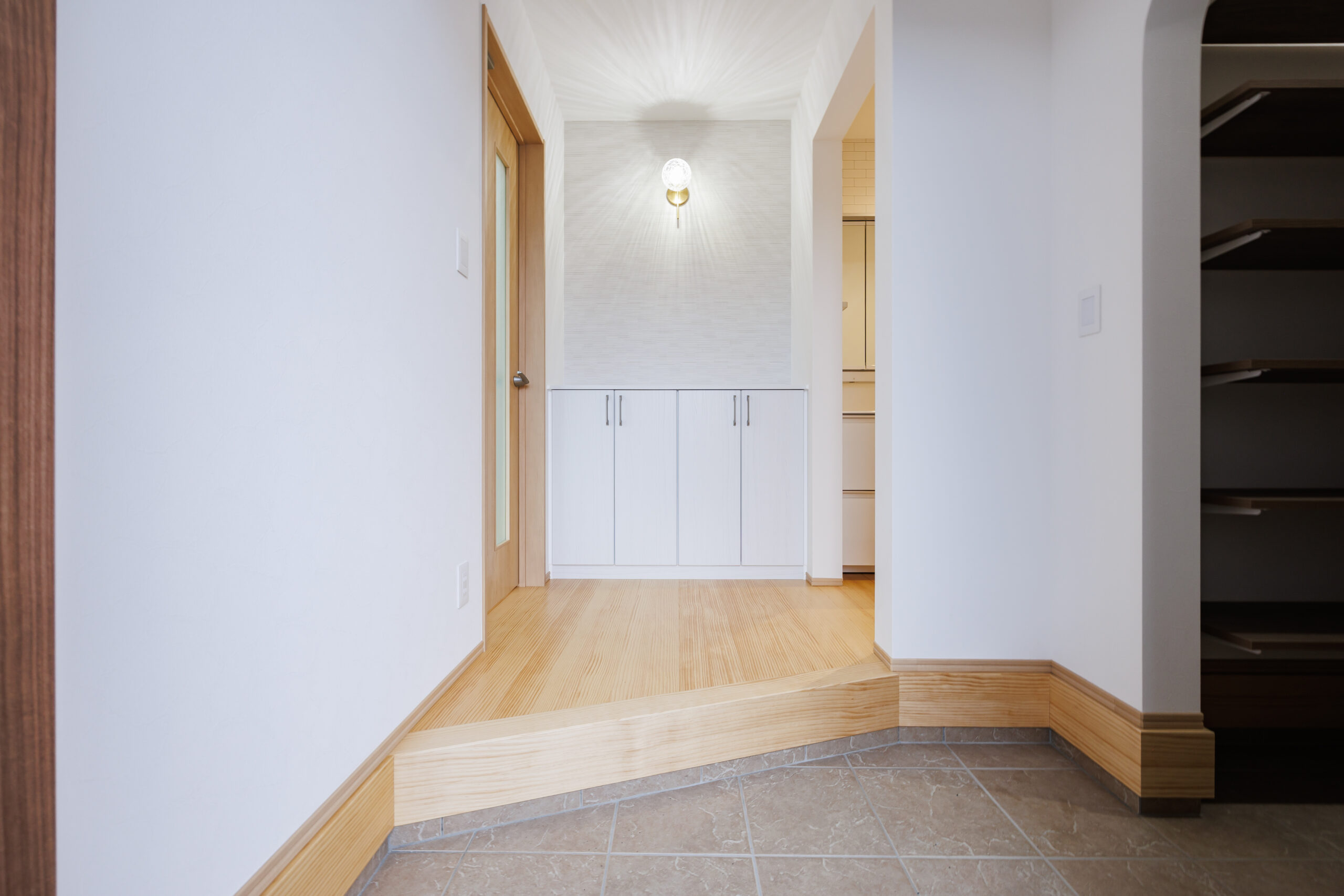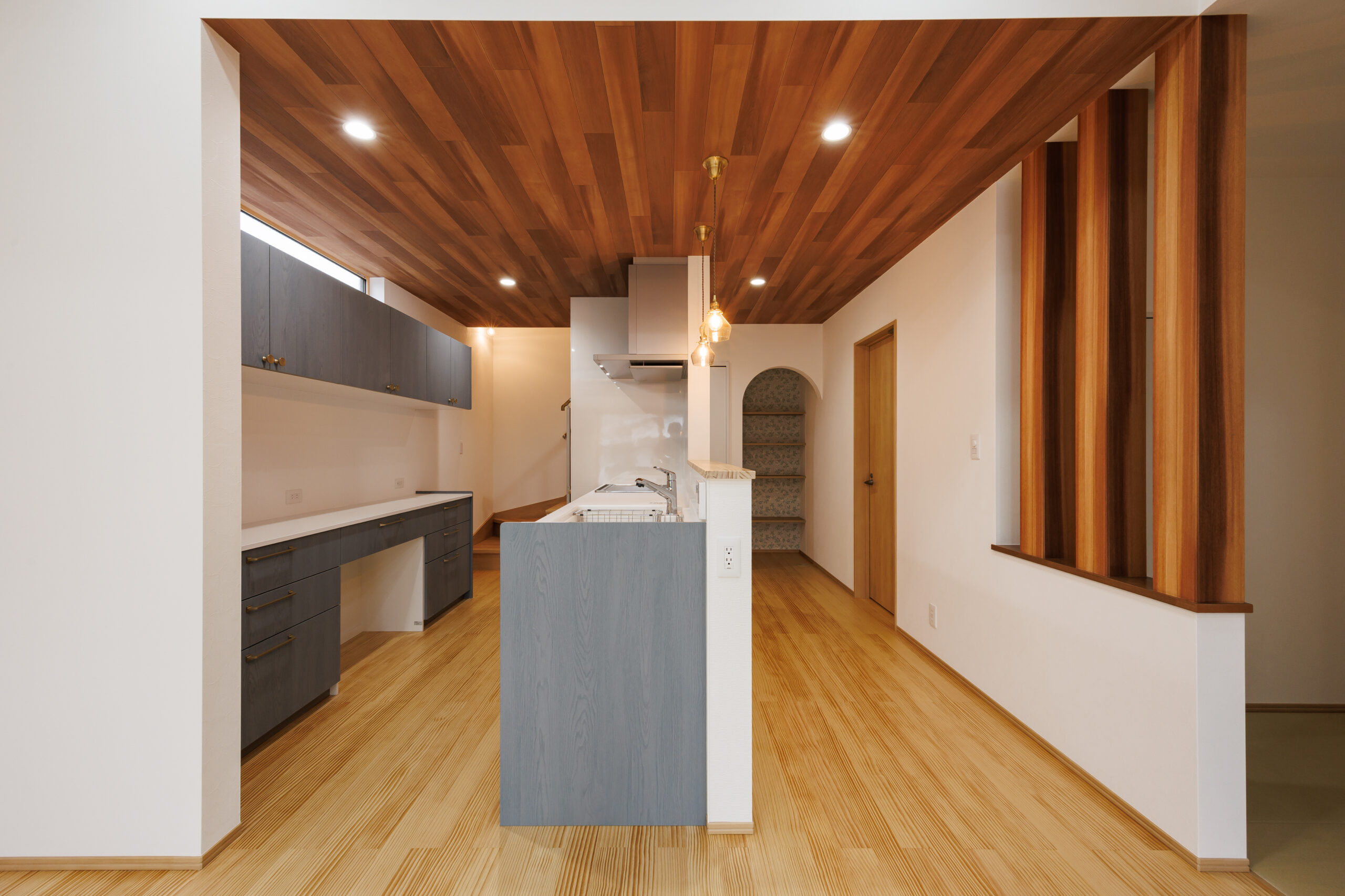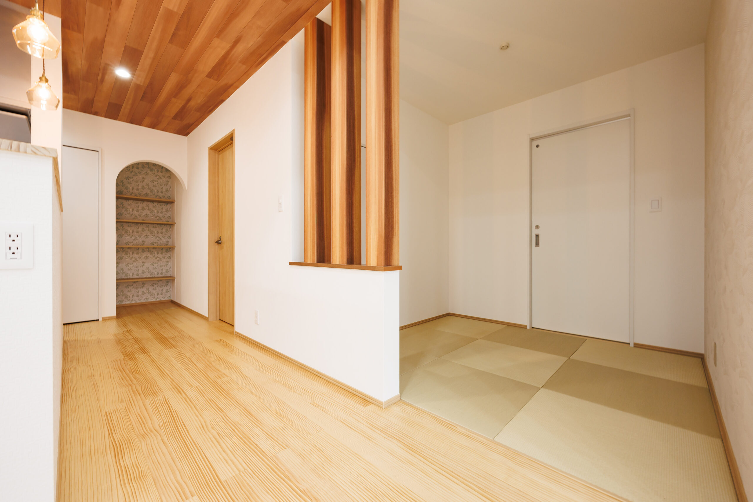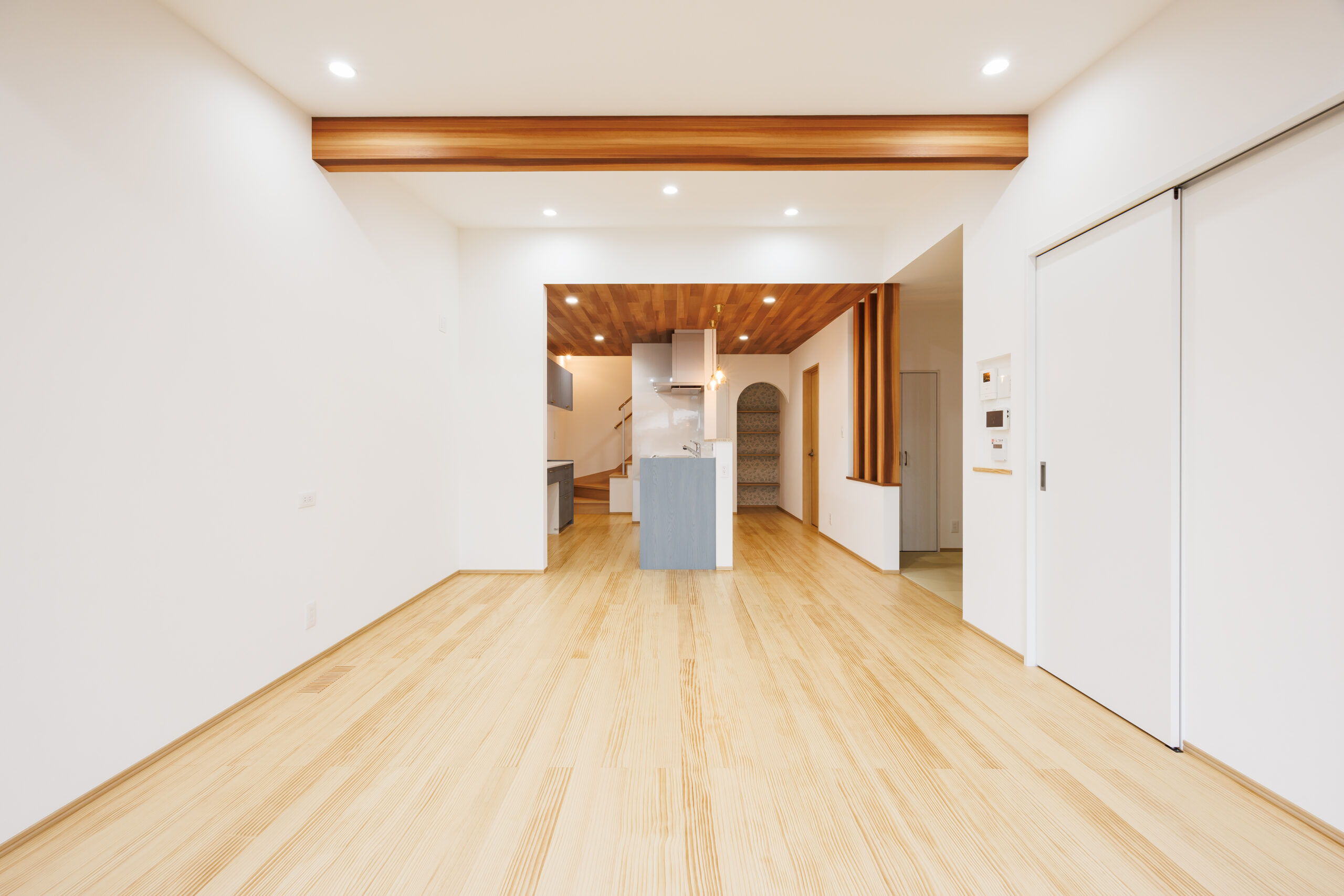 階段下のスペースも無駄なく活用し、アーチ状の垂れ壁をアクセントにした収納を設けることで、見た目の可愛らしさと実用性を兼ね備えています。