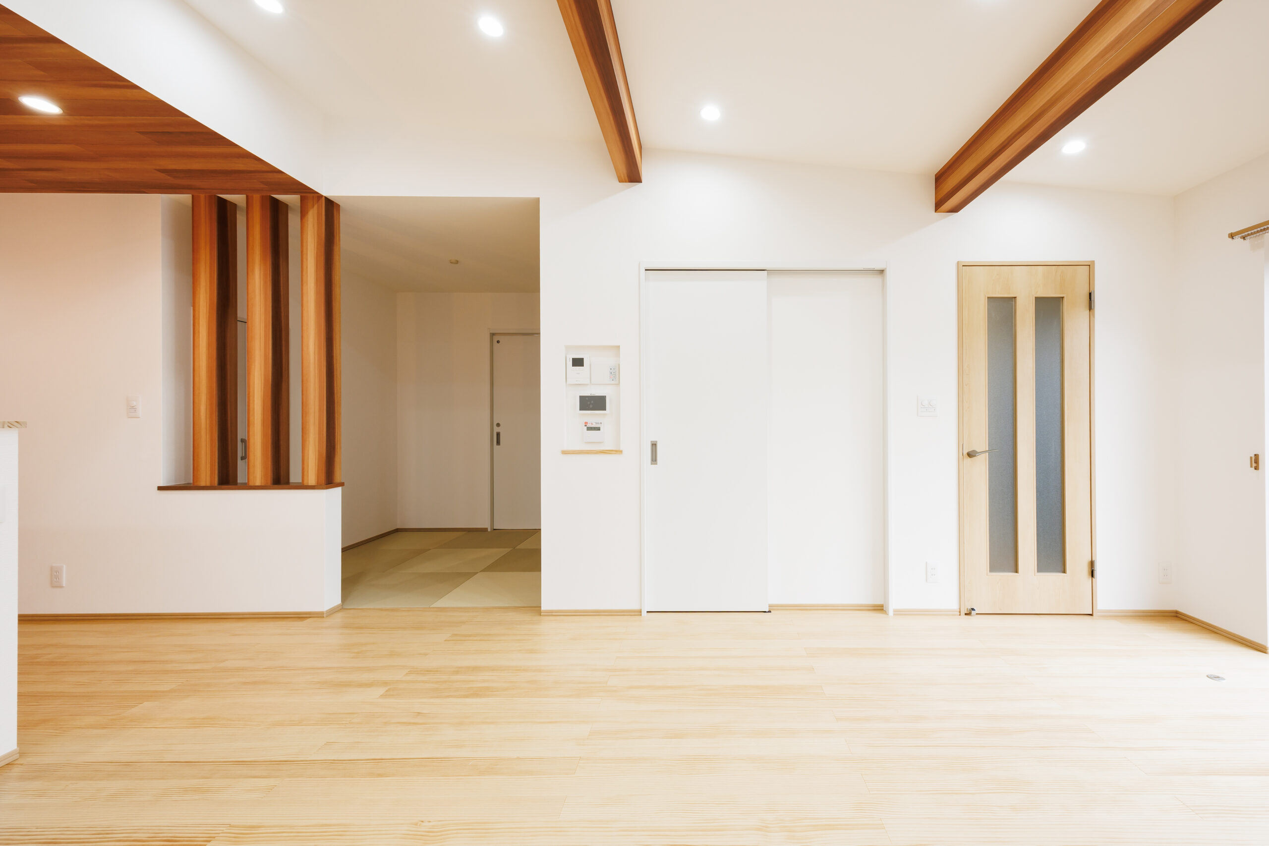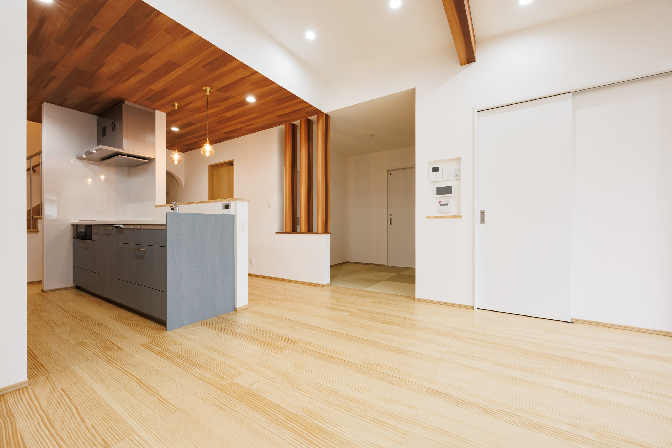 今回のお住まいは、勾配天井と見せ梁が印象的な開放感あふれる空間に、暮らしやすさを追求した「1階完結型」の間取りを掛け合わせた一邸です。