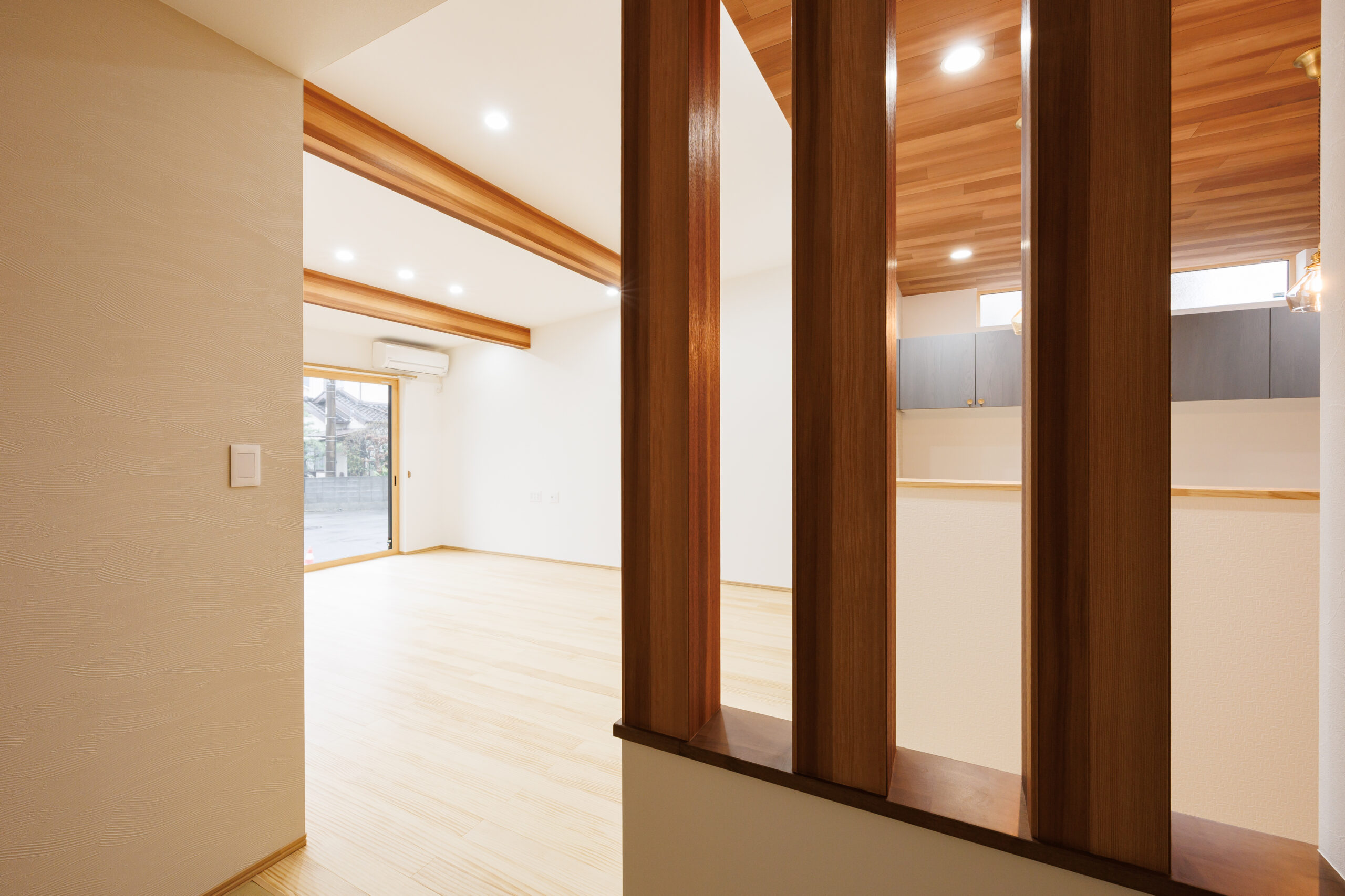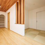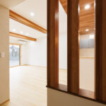LDKに隣接する和室は、筋交いをあえて見せたオープンなデザインに。空間の広がりを感じながら、構造美も楽しめる印象的な仕上がりです。さらに、階段ホールには大きなFIX窓と縦すべり窓を配置し、たっぷりと光を取り込むことで、日中は照明いらずの明るさを確保しています。