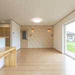 キッチンについた造作カウンターと石目調のアクセントクロスに加え、大開口の窓からリビングへ光が差し込み明るく温かい空間となっています。